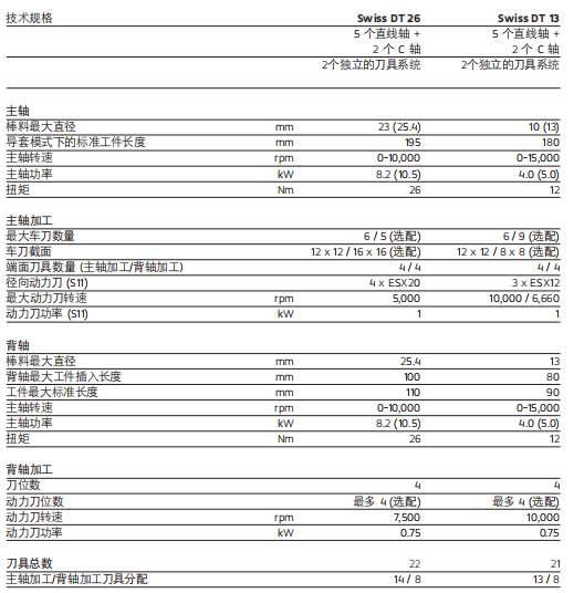 Swiss DT 系列瑞士型車床專業設計滿足典型長 短車削工件的各種要求。該系列機床簡單易 用,加工直徑達 13 和 25.4 mm,可顯著提高生 產效率。Swiss DT 系列采用先進的技術和高效的五軸運動結構,是所有車削和銑削加工的理想之選。